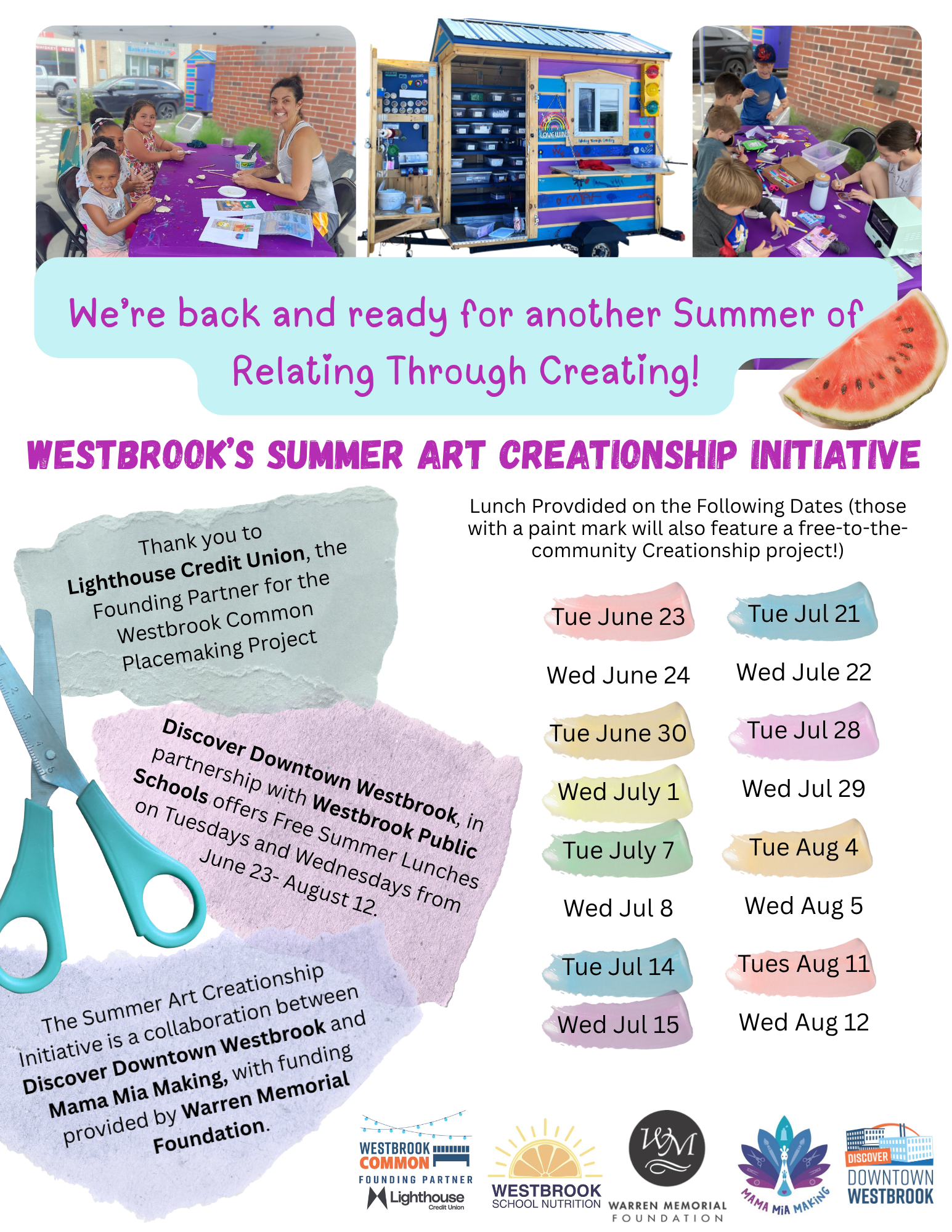 Join us on Tuesdays (and select Wednesdays) from June 23rd 2026 through August 11 2026 in Westbrook Common for a free craft from noon- 1 pm while supplies last. These craft projects will be hosted on days on which free lunch for community members under 18 will also be given out by Discover Downtown Westbrook in partnership with Westbrook School Nutrition. Big thank you to Lighthouse Credit Union, the founding partner for the Westbrook Common Placemaker Project and to Warren Memorial Foundation for their financial support of the Summer Art Creationship Initiative! See all dates below…